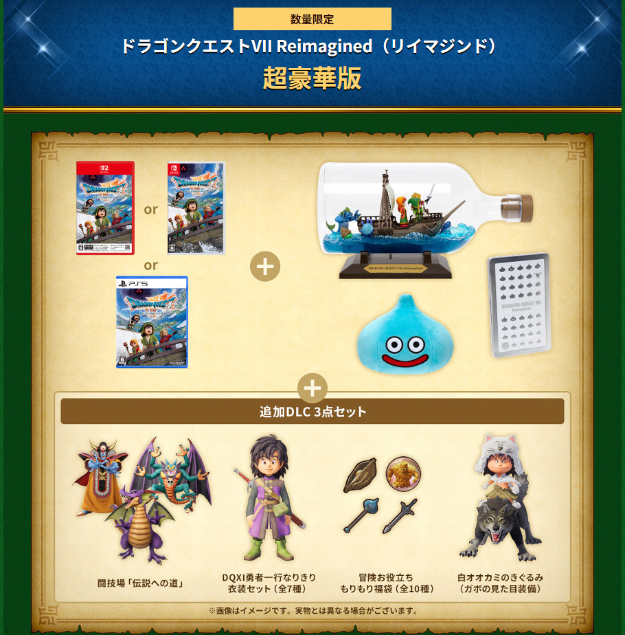 超豪華版(数量限定) | ・ゲーム(パッケージ版) ・ボトルシップ フィギュア ・スチールブックケース ・スマイルスライムぬいぐるみ M スライム DQVIIR ver. ・追加DLC3点セット - 闘技場「伝説への道」 - DQXI勇者一行なりきり衣装セット - 冒険お役立ちもりもり福袋 – 白オオカミのきぐるみ(ガボの見た目装備) | 29,800円 |